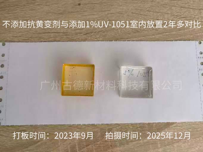 抗黃變劑UV-1051作為UV-1050的升級產(chǎn)品,繼承了優(yōu)異的抗紫外線性能外,著重提升了環(huán)氧樹脂其室內(nèi)抗黃變和抗熱老化性能。
